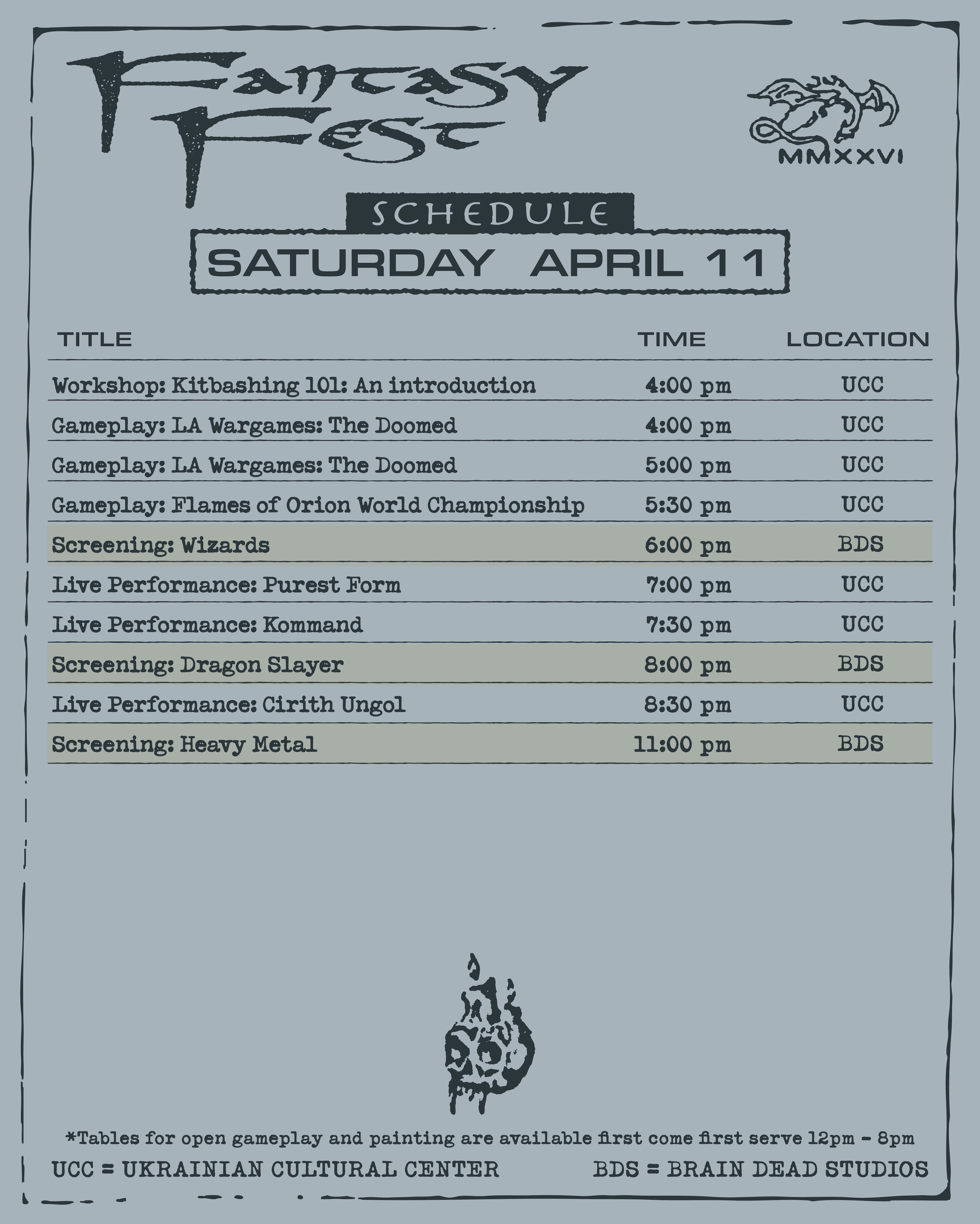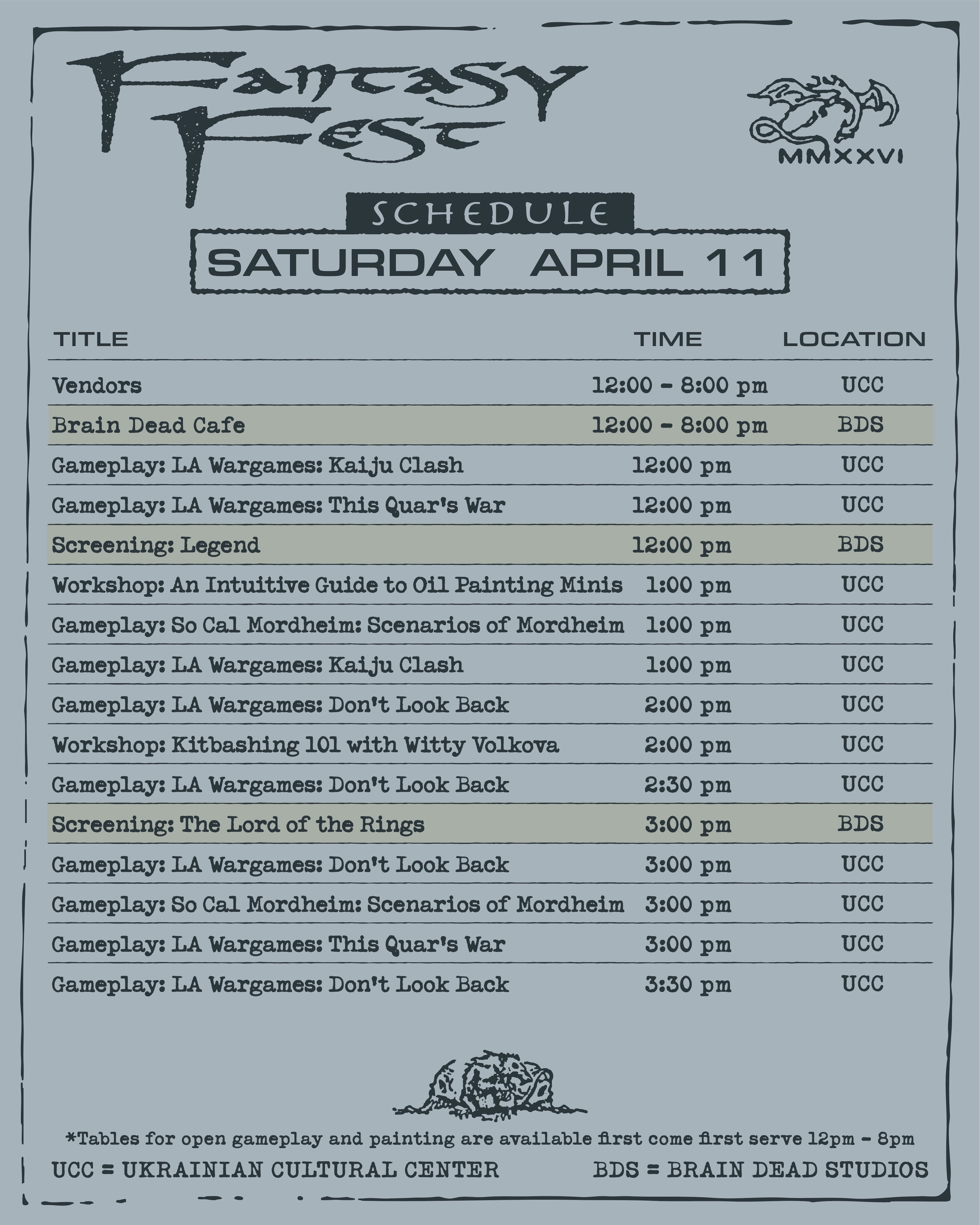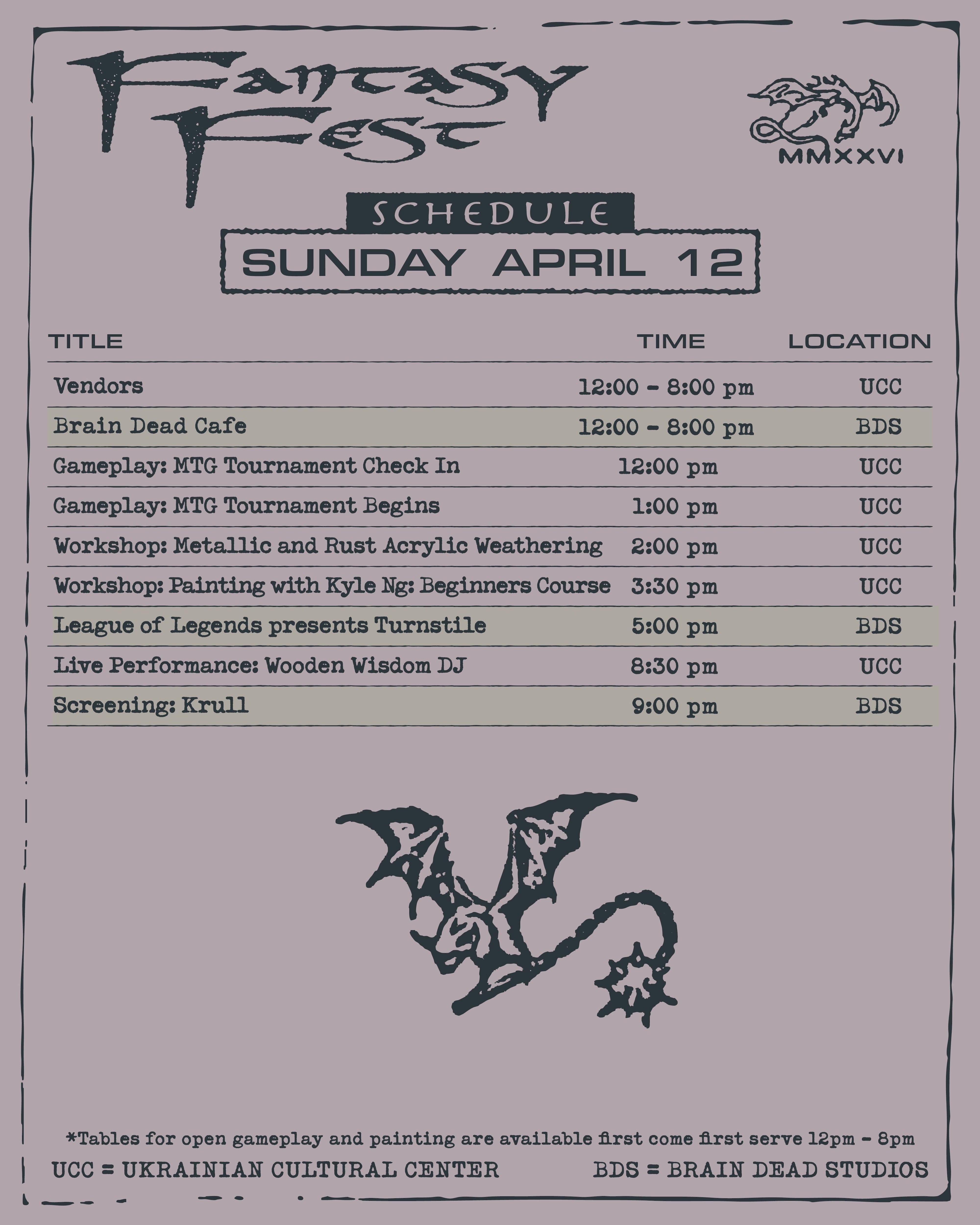 The vendor hall, open gameplay tables, and painting areas are located at the Ukrainian Cultural Center and are open from 12PM - 8PM.