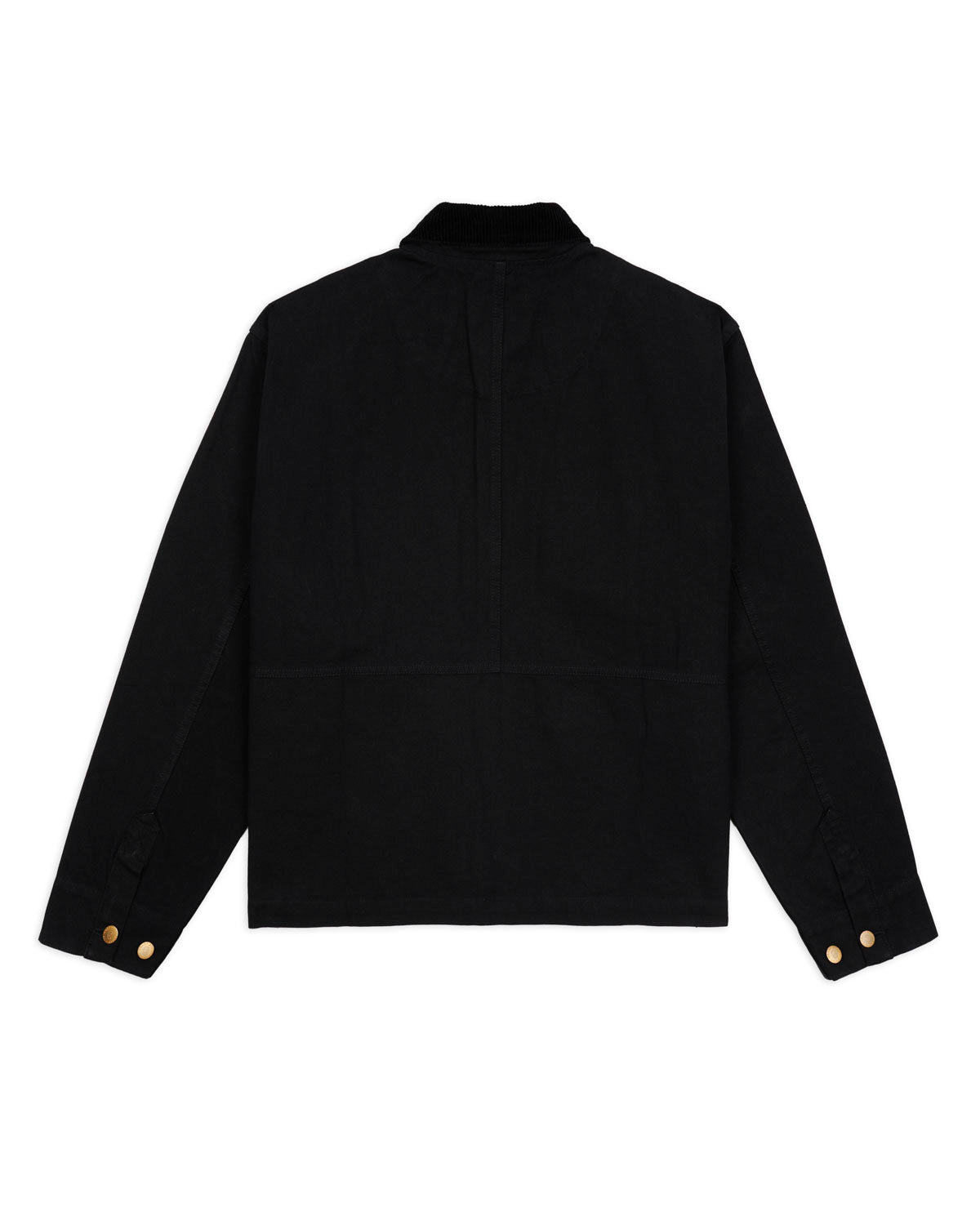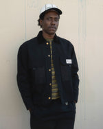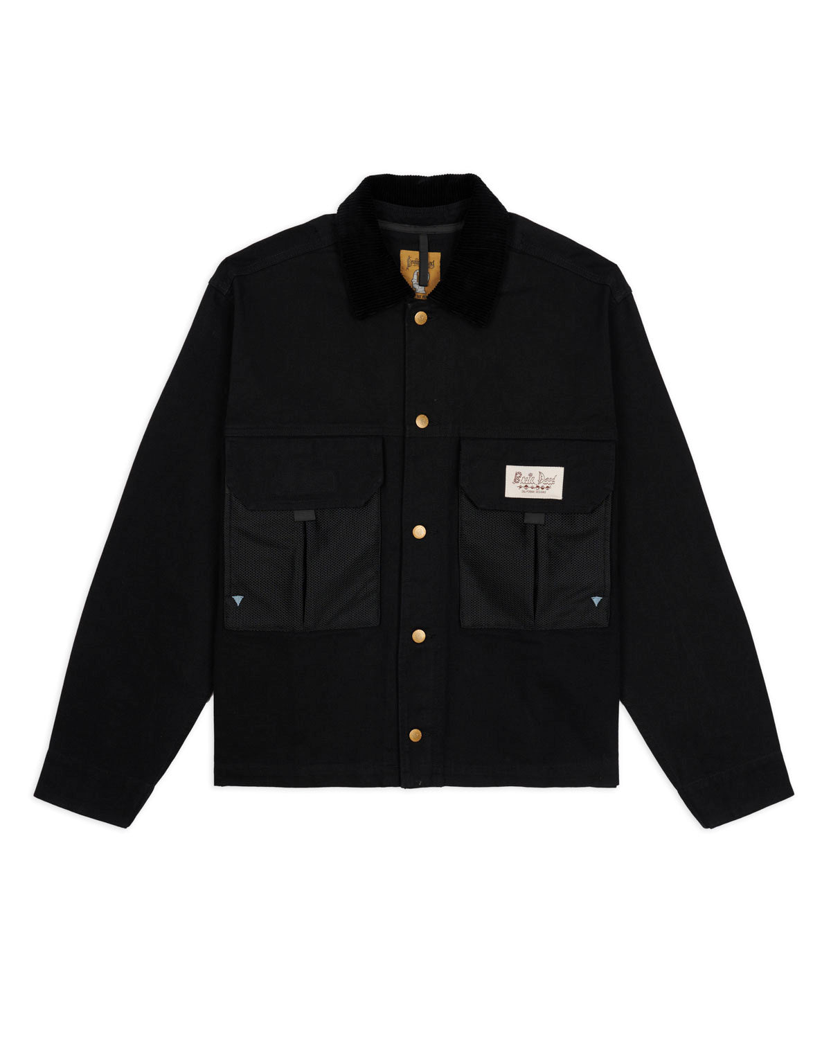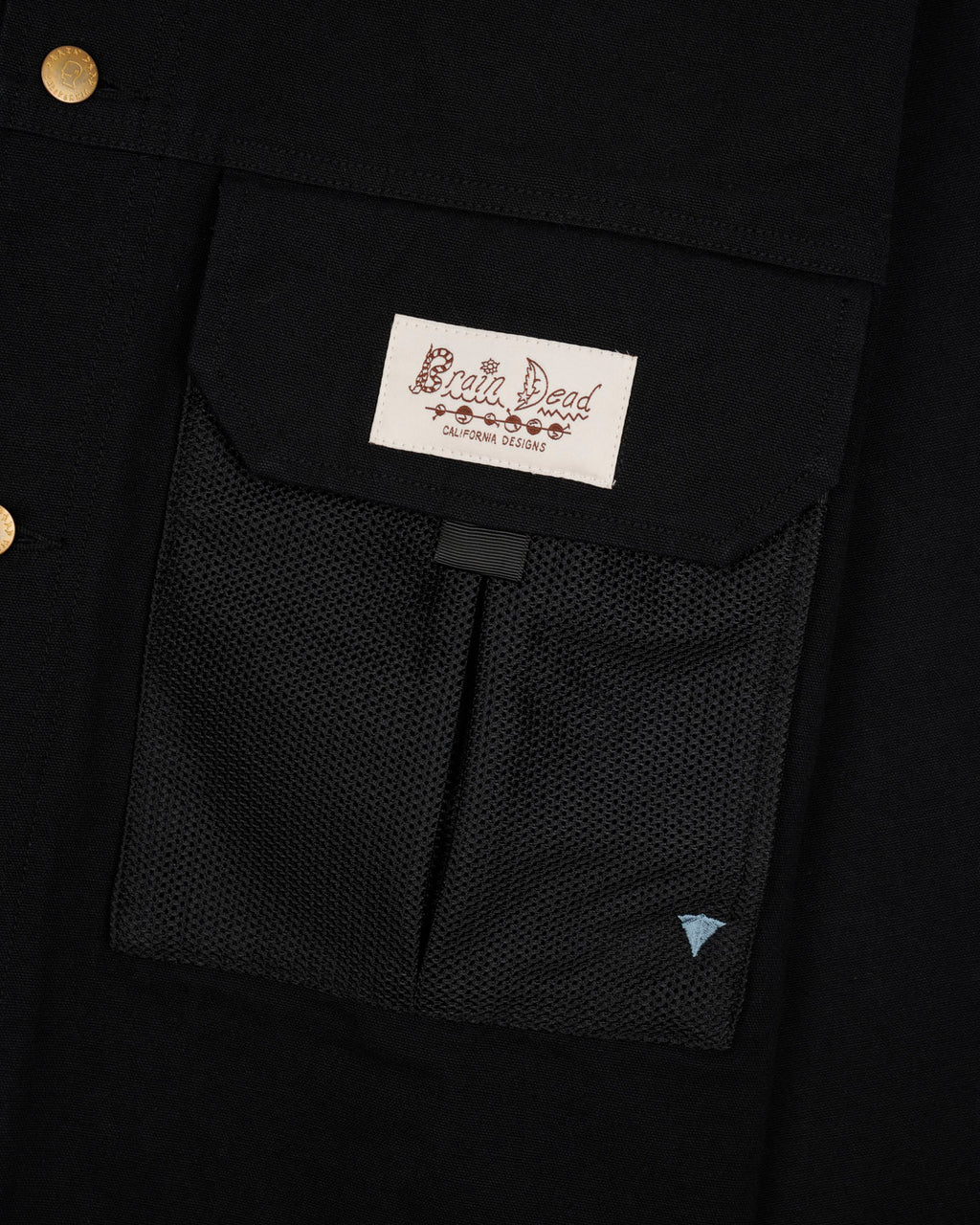 Our button-up cropped chore jacket with mesh front pockets and a ribbed collar. The cropped, boxy fit offers a silhouette ideal for layering. Finished with contrast binding throughout and a woven Brain Dead patch on the front chest pocket