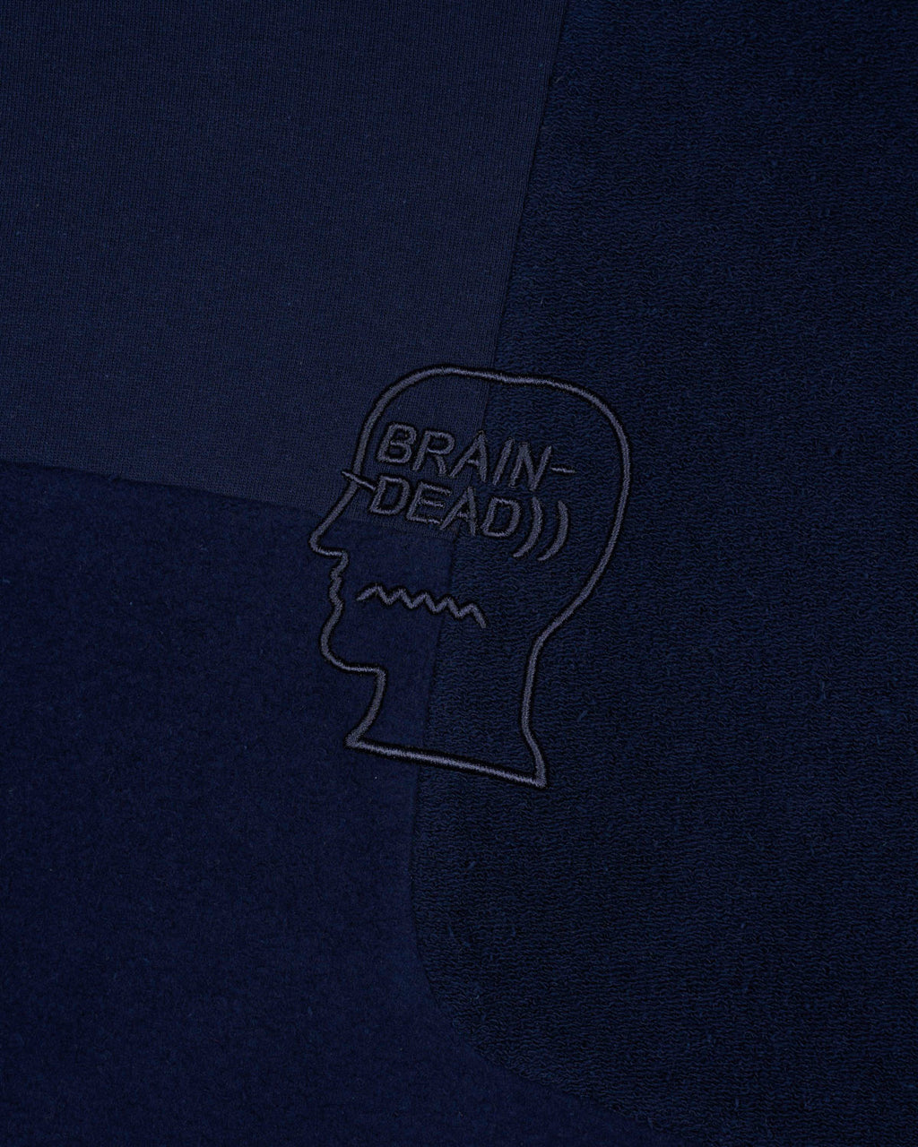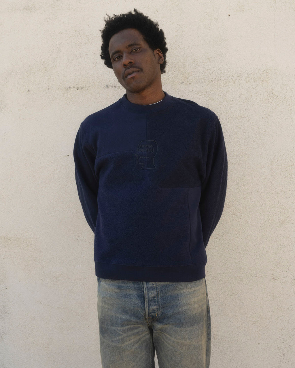 The crewneck is composed of panels of both materials. Finished with a 3D tonal logohead embroidery on the chest.